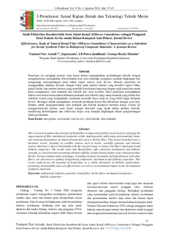 Yuniarti, Nur Azizah and Jupriyanto, Jupriyanto and I.B, Putra Jandhana and George, Royke Deksino (2024) Studi efektivitas karakteristik serat alami kenaf (hibiscus cannabinus) sebagai pengganti serat sintesis kevlar untuk bahan komposit anti peluru: jurnal review. J-Proteksion : Jurnal Kajian Ilmiah dan Teknologi Teknik Mesin, 9 (1): 6. pp. 37-45. ISSN 2528-6382