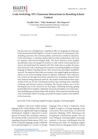 Faradila, Putri and Vidya, Mandarani and Fika, Megawati (2023) Code-switching: EFL classroom interactions in boarding school context. Journal of English Language, Literature, and Teaching (ELLITE), 8 (1): 6. pp. 44-53. ISSN 2527-4120