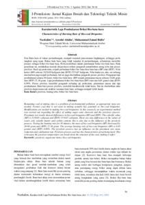 Sisa Batu bara di lokasi pertambangan, menjadi masalah pencemaran lingkungan, sehingga perlu langkah yang tepat. Bekas batu bara yang tidak terpakai di pertambangan, sebenarnya memiliki potensi sebagai briket bio-batu bara. Perlu modifikasi dalam pembuatan briket bio-batu bara. Pada penelitian ini, melakukan metode eksperimen terkait pengaruh penambahan arang tebu dan proses pirolisis. Hasil uji proksimat, terjadi perbedaan briket bio-batu bara batu bara (BP) dan (BTP). Nilai kalori (BP) sebesar 5129,05 kal/gram dan (BTP) 5374,87 kal/gram. Nilai kadar air, abu, zat terbang dan karbon juga terjadi perbedaan, hal ini juga disebabkan pengaruh proses pirolisis. Pengujian laju pembakaran selama 30 menit, briket bio-batu bara (BP) terjadi penurunan massa sebesar 24,68 gram dan (BTP) 27,36 gram. Laju pembakaran briket bio-batu bara (BP) rata-rata 0,85 gram/s dan (BTP) 0,99%. Proses pirolisis memiliki pengaruh terhadap uji proksimat, penurunan massa dan laju pembakaran. Batu bara proses pirolisis, memiliki karakteristik tidak keras. Hal ini disebabkan suhu pirolisis dapat memecah struktur susunan batu bara, sehingga menjadi lebih lunak.