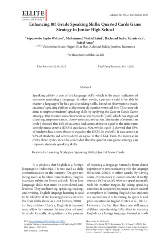 Suparwoto, Sapto Wahono and Muhammad, Wahid Zaini and Rachmad, Indra Kurniawan and Faizal, Anas (2023) Enhancing 8th grade speaking skills: quarted cards game strategy in junior high school. Journal of English Language, Literature, and Teaching (ELLITE), 8 (2): 7. pp. 135-141. ISSN 2527-4120