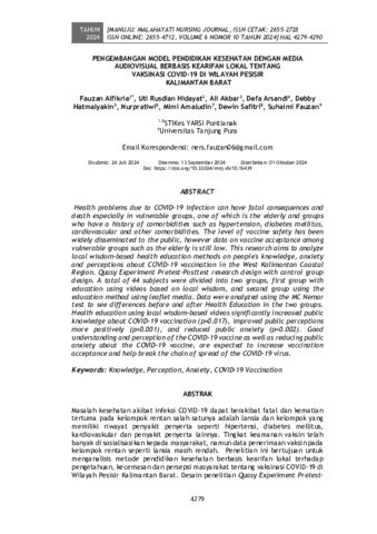 Fauzan, Alfikrie and Uti, Rusdian Hidayat and Ali, Akbar and Defa, Arsandi and Debby, Hatmalyakin and Nurpratiwi, Nurpratiwi and Mimi, Amaludin and Dewin, Safitri and Suhaimi, Fauzan (2024) Pengembangan model pendidikan kesehatan dengan media audiovisual berbasis kearifan lokal tentang vaksinasi Covid-19 di wilayah pesisir Kalimantan Barat. Manuju: Malahayati Nursing Journal, 6 (10): 37. pp. 4279-4290. ISSN 2655-2728