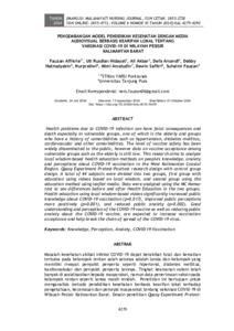 Masalah kesehatan akibat infeksi Covid-19 dapat berakibat fatal dan kematian tertuma pada kelompok rentan salah satunya adalah lansia dan kelompok yang memiliki riwayat penyakit penyerta seperti hipertensi, diabetes mellitus, kardiovaskular dan penyakit penyerta lainnya. Tingkat keamanan vaksin telah banyak di sosialisasikan kepada masyarakat, namun data penerimaan vaksin pada kelompok rentan seperti lansia masih rendah. Penelitian ini bertujuan untuk menganalisis metode pendidikan kesehatan berbasis kearifan lokal terhadap pengetahuan, kecemasan dan persepsi masyarakat tentang vaksinasi Covid-19 di Wilayah Pesisir Kalimantan Barat. Desain penelitian Quasy Experiment Pretest-Posttest with control group design. Sebanyak 44 subjek yang dibagi kedalam dua kelompok, yaitu kelompok dengan edukasi menggunakan video berbasis kearifan lokal, dan kelomok kontrol yaitu kelompok dengan metode edukasi dengan media leaflet. Data dianalisis menggunakan uji mc nemar untuk melihat perbedaan sebelum dan setelah Pendidikan Kesehatan pada kedua kelompok. Pendidikan Kesehatan menggunakan video berbasis kearifan lokal secara signifikan meningkatkan pengetahuan masyarakat tentang vaksinasi Covid-19 (p=0,017), memperbaiki persepsi masyarakat lebih positif (p=0,001), dan menurungkan kecemasan masyarakat (p=0,002). Pemahaman dan persepsi yang baik terhadap vaksin Covid-19 serta menurunnya rasa cemas masyarakat terhadap vaksin Covid-19, diharapkan dapat meningkatkan penerimaan vaksinasi dan membantu memutus rantai penyebaran virus Covid-19.