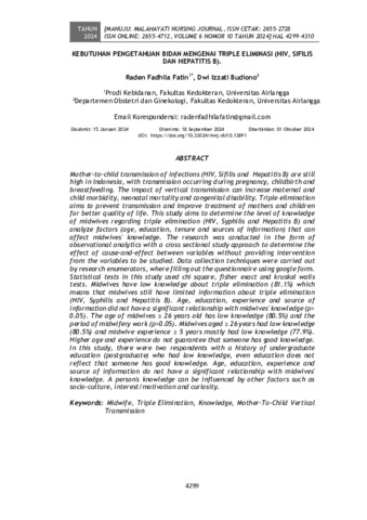 Raden, Fadhila Fatin and Dwi, Izzati Budiono (2024) Kebutuhan pengetahuan bidan mengenai triple eliminasi (HIV, sifilis, dan hepatitis B). Manuju: Malahayati Nursing Journal, 6 (10): 39. pp. 4299-4310. ISSN 2655-2728