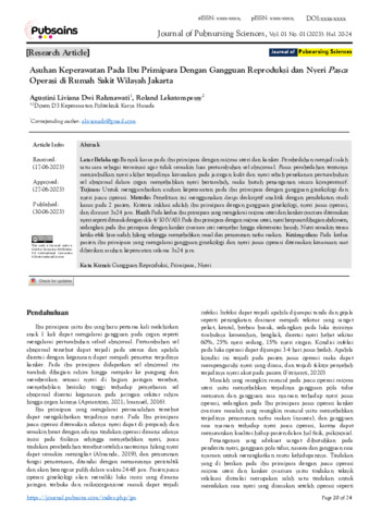 Agustini, Liviana Dwi Rahmawati and Roland, Lekatompessy (2023) Asuhan keperawatan pada ibu Primipara dengan gangguan reproduksi dan nyeri pasca operasi di rumah sakit wilayah Jakarta. Journal of Pubsains Sciences (JPS), 1 (1): 5. pp. 20-24. ISSN 3025-3330