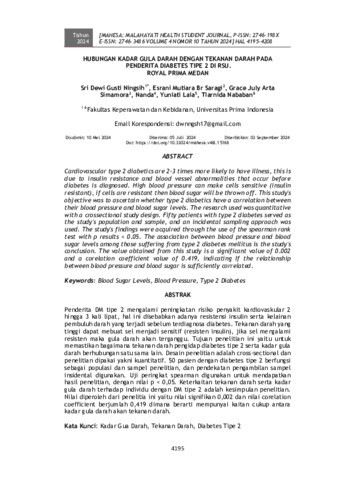 Sri, Dewi Gusti Ningsih and Esrani, Mutiara Br Saragi and Grace, July Arta Simamora and Nanda, Nanda and Yuniati, Laia and Tiarnida, Nababan (2024) Hubungan kadar gula darah dengan tekanan darah pada penderita diabetes tipe 2 di RSU Royal Prima Medan. MAHESA: Malahayati Health Student Journal, 4 (10): 2. pp. 4195-4208. ISSN 2746-198X