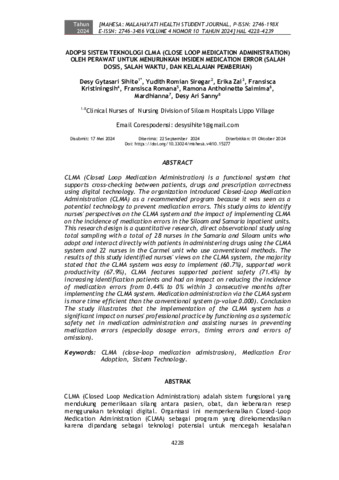 Desy, Gytasari Sihite and Yudith, Romian Siregar and Erika, Zai and Fransisca, Kristiningsih and Fransisca, Romana and Ramona, Anthoinette Saimima and Mardhianna, Mardhianna and Desy, Ari Sanny (2024) Adopsi sistem teknologi CLMA (Close Loop Medication Administration) oleh perawat untuk menurunkan insiden medication error (salah dosis, salah waktu, dan kelalaian pemberian). MAHESA: Malahayati Health Student Journal, 4 (10): 5. pp. 4228-4239. ISSN 2746-198X