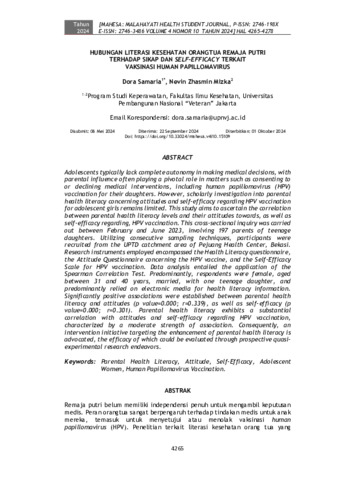 Dora, Samaria and Nevin, Zhasmin Mizka (2024) Hubungan literasi kesehatan orang tua remaja putri terhadap sikap dan self-efficacy terkait vaksinasi human papillomavirus. MAHESA: Malahayati Health Student Journal, 4 (10): 8. pp. 4265-4278. ISSN 2746-198X