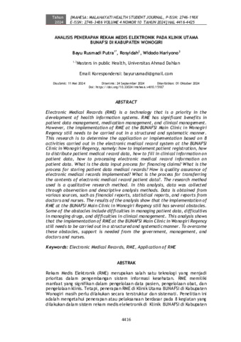 Bayu, Rusmadi Putra and Rosyidah, Rosyidah and Widodo, Hariyono (2024) Analisis penerapan rekam medis elektronik pada Klinik Utama BUNAFSI di Kabupaten Wonogiri. MAHESA: Malahayati Health Student Journal, 4 (10): 12. pp. 4416-4425. ISSN 2746-198X