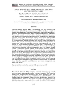 Rekam Medis Elektronik (RME) merupakan salah satu teknologi yang menjadi prioritas dalam pengembangan sistem informasi kesehatan. RME memiliki manfaat yang signifikan dalam pengelolaan data pasien, pengelolaan obat, dan pengelolaan klinis. Tetapi, penerapan RME di Klinik Utama BUNAFSI di Kabupaten Wonogiri masih perlu dilakukan secara terstruktur dan sistemati. Penelitian ini adalah mengetahui penerapan atau pelaksanaan berdasar pada 8 kegiatan yang dilakukan dalam sistem rekam medis eleketronik di Klinik BUNAFSI di Kabupaten Wonogiri, yaitu: bagaimana penerapan registrasi pasien, pelaksanaan distribusi data rekam medis pasien, Bagaimana proses pengisisan informasi klinis data pasien, Bagaimana pengolahan informasi rekam medis elektronik data pasien, Bagaimana proses penginputan data untuk klaim pembiayaan? Bagaimana proses penyimpanan rekam medis data pasien? Bagaimana pelaksanaan penjaminan mutu rekam medis elektronik? Bagaimana proses transfer isi rekam medis elektronik data pasien?. Metode penelitian yang digunakan adalah metode penelitian Kualitataif. Dalam analisis ini, dilakukan pengumpulan data melalui metode observasi dan analisis deskriptif. Data diperoleh dari berbagai sumber, seperti laporan keuangan, laporan statistik, dan laporan dari para dokter dan perawat. Hasil analisis menunjukkan bahwa penerapan RME di Klinik Utama BUNAFSI di Kabupaten Wonogiri masih ada beberapa kendala. Beberapa kendala antara lain adalah kesulitan dalam pengelolaan data pasien, kesulitan dalam pengelolaan obat, dan kesulitan dalam pengelolaan klinis. Dalam konklusi, analisis ini menunjukkan bahwa penerapan RME di Klinik Utama BUNAFSI di Kabupaten Wonogiri masih perlu dilakukan secara terstruktur dan sistematis. Untuk mengatasi kendala-kendala tersebut, diperlukan pendukungan dari pihak pemerintah, pihak manajemen, dan para dokter dan perawat.