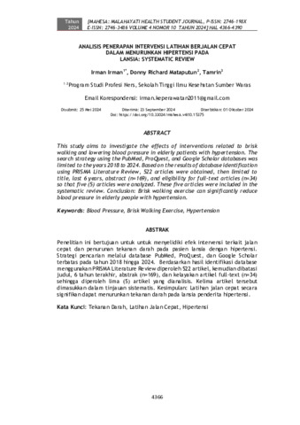 Irman, Irman and Donny, Richard Mataputun and Tamrin, Tamrin (2024) Analisis penerapan intervensi latihan berjalan cepat dalam menurunkan hipertensi pada lansia: Systematic Review. MAHESA: Malahayati Health Student Journal, 4 (10): 17. pp. 4366-4390. ISSN 2746-198X