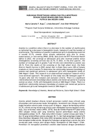 Maria, Camelia T. Bupu and Linda, Dewanti and Ivon, Diah Wittiarika (2024) Hubungan pengetahuan anemia dan pola menstruasi dengan kadar hemoglobin pada remaja putri dI SMA Negeri I Ende. MAHESA: Malahayati Health Student Journal, 4 (10): 20. pp. 4426-4433. ISSN 2746-198X