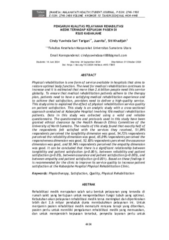 Cindy, Yuwinda Sari Tarigan and Juanita, Juanita and Siti, Khadijah (2024) Pengaruh kualitas pelayanan rehabilitasi medik terhadap kepuasan pasien di RSUD Kabanjahe. MAHESA: Malahayati Health Student Journal, 4 (10): 21. pp. 4434-4448. ISSN 2746-198X