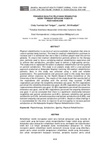 | Uncontrolled Keywords: | Fisioterapi, Kepuasan, Kualitas, Rehabilitasi medik, Patient satisfaction, Medical rehabilitation, Physiotherapy, Quality of services |