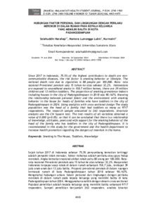 Sejak tahun 2017 di Indonesia sebesar 75,5% penyumbang kematian tertinggi adalah penyakit tidak menular, faktor risikonya adalah perilaku atau gaya hidup merokok. Angka kematian nasional akibat rokok yaitu 88 orang per 100.000. Rata- rata nasional Prevalensi perokok usia 15 tahun ke atas sebesar 32,2%. Masyarakat Indonesia terpapar asap rokok di dalam rumah sebanyak 158,7 juta, terdapat 39 juta anak-anak dan 13 juta balita. Proporsi prevalensi perokok di dalam ruangan termasuk rumah di kota Padangsidimpuan tahun 2018 sebesar 90,167%. Mengetahui hubungan antara fakor personal dan lingkungan dengan perilaku merokok di dalam rumah pada kepala keluarga yang memiliki balita di kota Padangsidmpuan tahun 2024. Menggunakan analitik dengan desain cross sectional Populasi penelitian adalah kepala keluarga yang memiliki balita sebanyak 9717 responden. Sampel penelitian berjumlah 263 responden. analisis bivariat menggunakan uji Chi Square. Hasil uji semua variabel diperoleh nilai 0,000 (p<0,05). sehingga dapat disimpulkan ada hubungan pengetahuan, sikap, teman sebaya dan dukungan istri terhadap perilaku merokok kepala keluarga yang memiliki balita di kota Padangsidimpuan. Disarankan dalam penelitian ini untuk pemerintah dan dinas Kesehatan untuk meningkatkan promosi Kesehatan mengenai bahaya meorkok di dalam rumah.
