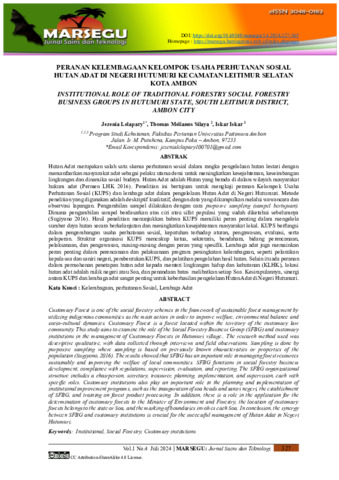 Jezenia, Lelapary and Thomas, Melianus Silaya and Iskar, Iskar (2024) Peranan kelembagaan kelompok usaha perhutanan sosial hutan adat di Negeri Hutumuri Kecamatan Leitimur Selatan Kota Ambon. Marsegu: Jurnal Sains dan Teknologi, 1 (4): 3. pp. 327-345. ISSN 3048-0183