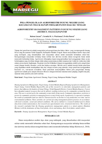 Rahma, Latara and Cornelia, M. A. Wattimena and Evelin, Parera (2024) Pola pengelolaan agroforestri dusung Negeri Liang Kecamatan Teluk Elpaputih Kabupaten Maluku Tengah. Marsegu: Jurnal Sains dan Teknologi, 1 (5): 2. pp. 417-425. ISSN 3048-0183
