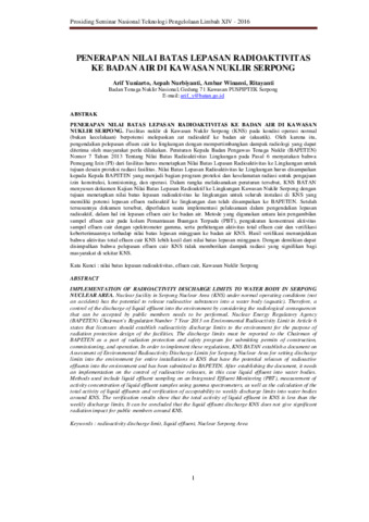 Yuniarto, Arif and Nurbianti, Aepah and Winansi, Ambar and Ritayanti, Ritayanti (2016) PENERAPAN NILAI BATAS LEPASAN RADIOAKTIVITAS KE BADAN AIR DI KAWASAN NUKLIR SERPONG. In: Prosiding Seminar Nasional Teknologi Pengelolaan Limbah XIV - 2016, Serpong.