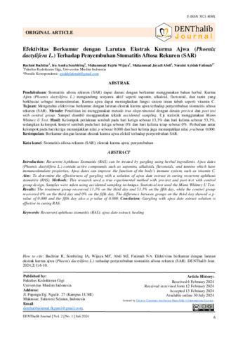 Rachmi, Bachtiar and Ira, Asnita Sembiring and Muhammad, Fajrin Wijaya and Muhammad, Jayadi Abdi and Nuraini, Ayidah Fatimah (2024) Efektivitas berkumur dengan larutan ekstrak kurma ajwa (Phoenix dactylifera L.) terhadap penyembuhan Stomatitis Aftosa Rekuren (SAR). Denthalib Journal, 2 (1): 2. pp. 6-10. ISSN 3021-808X