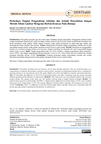 Ilmianti, Ilmianti and Sari, Aldilawati and Rini, Pratiwi and Rachmi, Bachtiar and Muh., Alif Madwa (2024) Perbedaan tingkat pengetahuan sebelum dan setelah penyuluhan dengan metode tebak gambar mengenai herbal dentistry pada remaja. Denthalib Journal, 2 (1): 5. pp. 22-26. ISSN 3021-808X