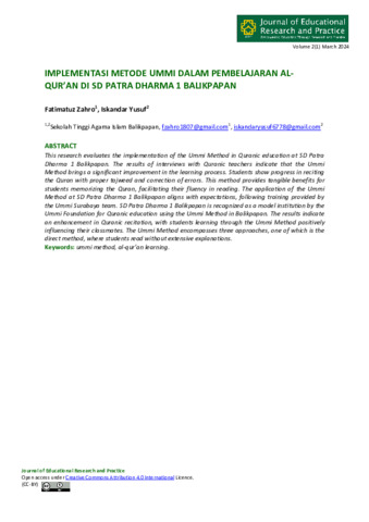 Fatimatuz, Zahro and Iskandar, Yusuf (2024) Implementasi metode Ummi dalam pembelajaran Al-Qur’an di SD Patra Dharma 1 Balikpapan. Journal of Educational Research and Practice, 2 (1): 8. pp. 88-97. ISSN 3062-7613