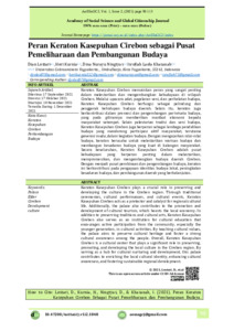 Dian, Lestari and Heri, Kurnia and Dina, Nurayu Ningtyas and Isrofiah, Laela Khasanah (2021) Peran Keraton Kasepuhan Cirebon sebagai pusat pemeliharaan dan pembangunan budaya. Academy of Social Science and Global Citizenship Journal, 1 (2): 5. pp. 97-113. ISSN 2988-7968