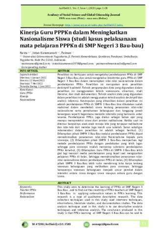 Nasra, Nasra and Intan, Kusumawati and Paiman, Paiman (2022) Kinerja guru PPKn dalam meningkatkan nasionalisme siswa (studi kasus pelaksanaan mata pelajaran PPKn di SMP Negeri 3 Bau-bau). Academy of Social Science and Global Citizenship Journal, 2 (1): 2. pp. 11-20. ISSN 2988-7968