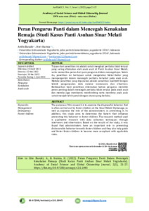 Arifin, Basuki and Heri, Kurnia (2022) Peran pengurus panti dalam mencegah kenakalan remaja (studi kasus Panti Asuhan Sinar Melati Yogyakarta). Academy of Social Science and Global Citizenship Journal, 2 (1): 3. pp. 21-27. ISSN 2988-7968