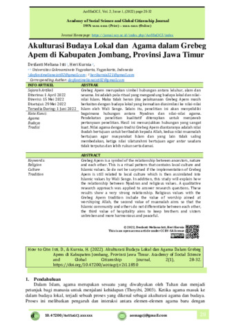 Desfanti, Meliana Isti and Heri, Kurnia (2022) Akulturasi budaya lokal dan agama dalam Grebeg Apem di Kabupaten Jombang, Provinsi Jawa Timur. Academy of Social Science and Global Citizenship Journal, 2 (1): 4. pp. 28-32. ISSN 2988-7968