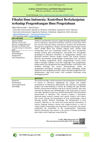 Alfian, Fahrurrozhi and Heri, Kurnia (2022) Filsafat ilmu Indonesia: kontribusi berkelanjutan terhadap pengembangan ilmu pengetahuan. Academy of Social Science and Global Citizenship Journal, 2 (2): 2. pp. 61-67. ISSN 2988-7968