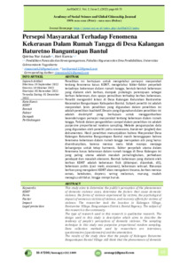 Penelitian ini bertujuan untuk mengetahui persepsi masyarakat tentang fenomena kasus KDRT, mengetahui faktor-faktor penyebab terjadinya kekerasan dalam rumah tangga, bentuk-bentuk kekerasan yang dialami oleh korban, dampak psikologis perempuan sebagai korban kekerasan, dan upaya pemulihan terhadap korban kekerasan. Peneliti mengambil lokasi di Desa Kalangan Kelurahan Banturetno Kecamatan Banguntapan Kabupaten Bantul. Subyek peneliti ini adalah masyarakat. Jenis penelitian yang digunakan dalam penelitian ini adalah penelitian kualitatif. Desain yang digunakan dalam penelitian ini adalah deskriptif yang bertujuan untuk menggambarkan kecenderungan persepsi masyarakat tentang kekerasan dalam rumah tangga. Teknik dalam pengambilan sampel dalam penelitian ini adalah purposive proportional random sampling. Metode pengumpulan data yang digunakan oleh peneliti yaitu wawancara, kuesioner (angket) dan dokumentasi. Hasil penelitian menunjukkan bahwa Masyarakat Desa Kalangan Baturetno Banguntapan Bantul masih beranggapan bahwa fenomena kekerasan dalam rumah tangga merupakan aib yang harus disembunyikan, karena merasa malu tidak mampu menjaga keluarganya untuk tetap harmonis. faktor penyebab utama dalam fenomena kasus kekerasan dalam rumah tangga di Desa Kalangan ini yang paling utama adalah masalah perselingkuhan, perbedaan pendapat dan masalah ekonomi. Bentuk kekerasan yang dialami oleh korban KDRT adalah kekerasan fisik (ditampar, dijambak, dll), kekerasan psikis (caci maki, ancaman), kekerasan seksual. Biasanya korban yang mengalami KDRT akan mengalami trauma, korban merasa cemas, ketakutan, depresi, sering melamun, murung, mudah menagis,sulit tidur, hingga mimpi buruk.