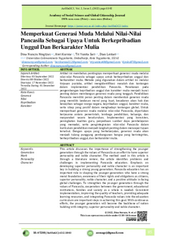 Dina, Nurayu Ningtyas and Heri, Kurnia and Tri, Yunita Sari and Dian, Lestari (2022) Memperkuat generasi muda melalui nilai-nilai Pancasila sebagai upaya berkepribadian unggul dan berkarakter mulia. Academy of Social Science and Global Citizenship Journal, 2 (2): 5. pp. 85-92. ISSN 2988-7968