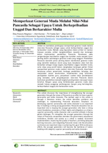 Artikel ini membahas pentingnya memperkuat generasi muda melalui nilai-nilai Pancasila sebagai upaya untuk berkepribadian unggul dan berkarakter mulia. Metode yang digunakan dalam artikel ini melalui tinjauan pustaka, artikel mengidentifikasi masalah dan tantangan dalam implementasi pendidikan Pancasila. Penekanan pada pengembangan kepribadian unggul dan karakter mulia menjadi kunci penting dalam membangun generasi muda yang tangguh. Pendidikan Pancasila memiliki peran penting dalam membentuk generasi muda yang memiliki landasan moral yang kuat, kesadaran akan hak dan kewajiban sebagai warga negara, kepribadian unggul, karakter mulia, serta sikap yang positif dalam menghadapi tantangan global. Untuk memperkuat generasi muda melalui nilai-nilai Pancasila, diperlukan kerjasama antara pemerintah, lembaga pendidikan, keluarga, dan masyarakat secara keseluruhan. Implementasi yang konsisten, peningkatan kualitas guru, penyediaan sumber daya pembelajaran yang memadai, serta pengintegrasian nilai-nilai Pancasila dalam kurikulum pendidikan menjadi langkah penting dalam mencapai tujuan tersebut. Dengan upaya yang berkelanjutan, generasi muda akan menjadi tulang punggung pembangunan bangsa yang berintegritas, berkepribadian unggul, dan berkarakter mulia.