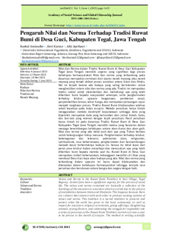 Haekal, Aminudin and Heri, Kurnia and Afni, Apriliani (2023) Pengaruh nilai dan norma terhadap tradisi ruwat bumi di Desa Guci, Kabupaten Tegal, Jawa Tengah. Academy of Social Science and Global Citizenship Journal, 3 (1): 3. pp. 14-23. ISSN 2988-7968