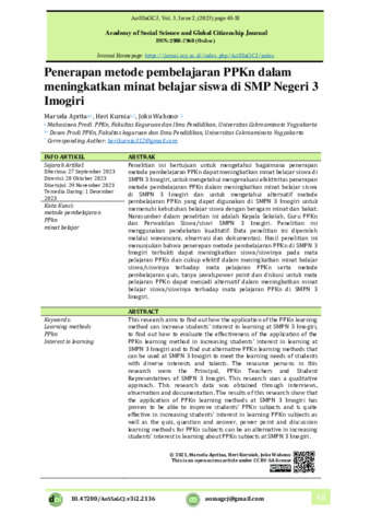 Marsela, Aprita and Heri, Kurnia and Joko, Wahono (2023) Penerapan metode pembelajaran PPKn dalam meningkatkan minat belajar siswa di SMP Negeri 3 Imogiri. Academy of Social Science and Global Citizenship Journal, 3 (2): 2. pp. 48-58. ISSN 2988-7968