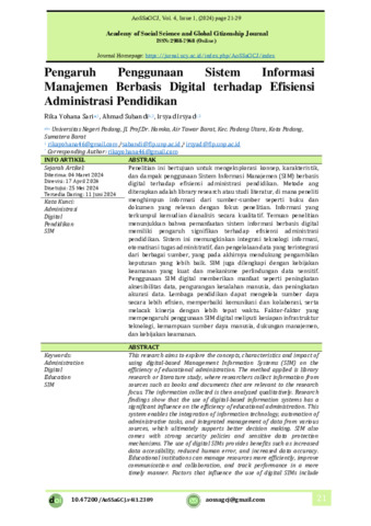 Rika, Yohana Sari and Ahmad, Subandi and Irsyad, Irsyad (2024) Pengaruh penggunaan sistem informasi manajemen berbasis digital terhadap efisiensi administrasi pendidikan. Academy of Social Science and Global Citizenship Journal, 4 (1): 3. pp. 21-29. ISSN 2988-7968