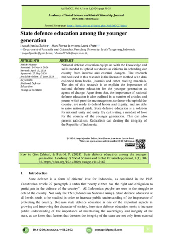 Inayah, Junika Zahira and Mas, Fierna Janvierna Lussie Putri (2024) State defence education among the younger generation. Academy of Social Science and Global Citizenship Journal, 4 (1): 4. pp. 30-36. ISSN 2988-7968