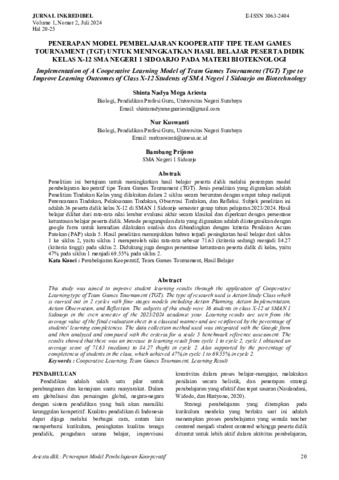 Shinta, Nadya Mega Ariesta and Nur, Kuswanti and Bambang, Prijono (2024) Penerapan model pembelajaran kooperatif tipe Team Games Tournament (TGT) untuk meningkatkan hasil belajar peserta didik kelas X-12 SMA Negeri 1 Sidoarjo pada materi bioteknologi. Jurnal Inkredibel, 1 (1): 4. pp. 20-25. ISSN 3063-2404