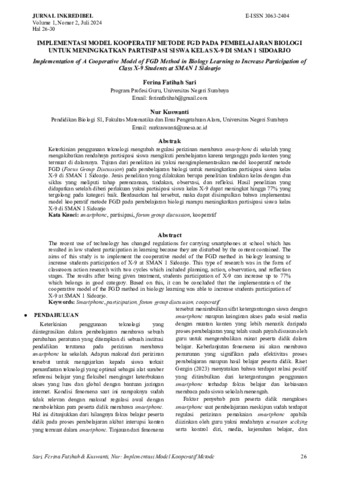 Ferina, Fatihah Sari and Nur Kuswanti, Kuswanti (2024) Implementasi model kooperatif metode FGD pada pembelajaran biologi untuk meningkatkan partisipasi siswa kelas X-9 di SMAN 1 Sidoarjo. Jurnal Inkredibel, 1 (1): 5. pp. 26-30. ISSN 3063-2404