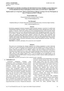 Keterkinian penggunaan teknologi mengubah regulasi perizinan membawa smartphone di sekolah yang mengakibatkan rendahnya partisipasi siswa mengikuti pembelajaran karena terganggu pada konten yang termuat di dalamnya. Tujuan dari penelitian ini yakni mengimplementasikan model kooperatif metode FGD (Focus Group Discussion) pada pembelajaran biologi untuk meningkatkan partisipasi siswa kelas X-9 di SMAN 1 Sidoarjo. Jenis penelitian yang dilakukan berupa penelitian tindakan kelas dengan dua siklus yang meliputi tahap perencanaan, tindakan, observasi, dan refleksi. Hasil penelitian yang didapatkan setelah diberi perlakuan yakni partisipasi siswa kelas X-9 dapat meningkat hingga 77% yang tergolong pada kategori baik. Berdasarkan hal tersebut, maka dapat disimpulkan bahwa implementasi model kooperatif metode FGD pada pembelajaran biologi mampu meningkatkan partisipasi siswa kelas X-9 di SMAN 1 Sidoarjo.