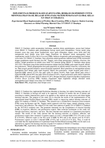 Ayu, Ni’matus Solikah and Aini, Aini (2024) Implementasi Problem Based Learning (PBL) berbasis eksperimen untuk meningkatkan hasil belajar siswa pada materi pemanasan global kelas X-9 SMAN 15 Surabaya. Jurnal Inkredibel, 1 (1): 8. pp. 48-53. ISSN 3063-2404
