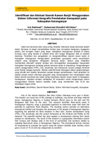 Salah satu bencana alam yang sering melanda Indonesia setiap tahunnya adalah banjir. Bencana ini dapat menyebabkan korban jiwa, kerusakan bangunan, kegagalan panen, dan kerugian materi yang besar. Kabupaten karanganyar terletak di antara Gunung Lawu yang berada di sebelah timur dan Sungai Bengawan Solo di sebelah baratnya. Penelitian dan pengabdian ini mengindentifikasi daerah rawan banjir di Kabupaten Karanganyar menggunakan pendekatan geospasial untuk menentukan wilayah yang berpotensi mengalami bencana banjir. Sistem yang dihasilkan memberikan alternatif metode edukasi dan meningkatkan kewaspadaan masyarakat Kabupaten Karanganyar terhadap potensi bencana banjir di wilayahnya. Pengembangan sistem menggunakan HTML, CSS, JavaScript, dan framework Laravel sebagai frontend serta MySQL sebagai backend. Metode waterfall telah diterapkan dalam pengembangan yang dimulai dari analisis kebutuhan sampai dengan pemeliharaan. Hasil penelitian ini adalah sebuah sistem informasi geografis yang menyampaikan dan menampilkan data dalam bentuk koordinat dan lokasi terkait pemetaan daerah rawan banjir di Kabupaten Karanganyar. Kegiatan edukasi melibatkan 30 responden untuk mengevaluasi sistem menggunakan metode System Usability Scale, yang memberikan nilai 73,33 dan berkategori bagus sekali.