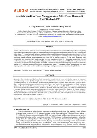 M., Asep Rizkiawan and Eko, Kurniawan and Harry, Ramza (2024) Analisis kualitas daya menggunakan filter daya harmonik aktif berbasis PV. Jurnal Teknik Elektro dan Komputasi (ELKOM), 6 (2): 2. pp. 154-163. ISSN 2685-1814