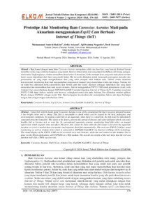 Salah satu ikan hias yang sangat diminati karena warnanya yang cerah dan harganya yang murah adalah ikan komet dengan nama latin Carassius auratus. Ikan ini cukup rentan mati yang dapat disebabkan oleh inang, patogen, dan lingkungannya. Untuk mengurangi dampak ikan mati terhadap ikan yang hidup dalam akuarium tersebut ketika pemilik berada jauh dari lokasi akuarium berada, maka diperlukannya alat yang dapat memonitoring dan memisahkan ikan mati dengan menggunakan ESP32 cam sebagai monitoring dan Arduino uno yang terhubung dengan ESP8266 nodemcu secara internet of things menggunakan web browser untuk tampilan ESP32 cam dan aplikasi blynk untuk kendali alat pada Arduino uno yang terhubung dengan ESP8266 nodemcu sebagai modul wifinya. Dengan membangun suatu sistem alat yang dapat memonitoring dan memisahkan ikan mati pada akuarium. Perlu dilakukannya perencanaan mulai dengan pengamatan terhadap objek yaitu ikan Carassius auratus dan studi literatur tentang komponen alat yang digunakan untuk memudahkan dalam mendesain sistem monitoring dan sistem pemisah ikan mati dari akuarium. Setelah alat untuk memonitoring dan pemisah ikan mati dari akuarium selesai dibangun, maka diperlukannya percobaan dan pengujian dari alat tersebut. Dari hasil pengujian sistem monitoring dan pemisah ikan dari akuarium yang dilakukan, alat sudah berfungsi cukup baik untuk memonitoring menggunakan ESP32 cam untuk ditampilkan pada web browser ponsel dan memisahkan ikan mati dari akuarium menggunakan sistem kendali pada aplikasi blynk untuk menjalankan Arduino uno yang terhudung dengan ESP8266 nodemcu secara internet of things.