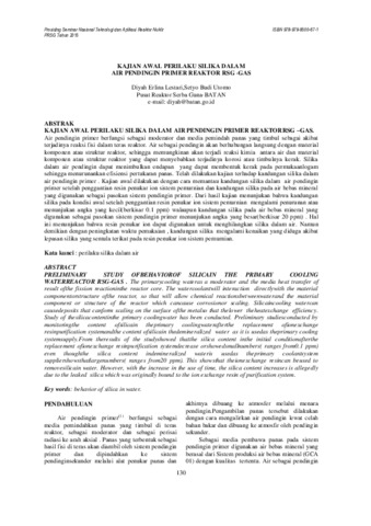 KAJIAN AWAL PERILAKU SILIKA DALAM AIR PENDINGIN PRIMER REAKTORRSG –GAS. Air pendingin primer berfungsi sebagai moderator dan media pemindah panas yang timbul sebagai akibat terjadinya reaksi fisi dalam teras reaktor. Air sebagai pendingin akan berhubungan langsung dengan material komponen atau struktur reaktor, sehingga memungkinan akan terjadi reaksi kimia antara air dan material komponen atau struktur reaktor yang dapat menyebabkan terjadinya korosi atau timbulnya kerak. Silika dalam air pendingin dapat menimbulkan endapan yang dapat membentuk kerak pada permukaanlogam sehingga menurunankan efisiensi pertukaran panas. Telah dilakukan kajian terhadap kandungan silika dalam air pendingin primer . Kajian awal dilakukan dengan cara memantau kandungan silika dalam air pendingin primer setelah penggantian resin penukar ion sistem pemurnian dan kandungan silika pada air bebas mineral yang digunakan sebagai pasokan sistem pendingin primer. Dari hasil kajian menunjukan bahwa kandungan silika pada kondisi awal setelah penggantian resin penukar ion sistem pemurnian mengalami penurunan atau menunjukan angka yang kecil(berkisar 0.1 ppm) walaupun kandungan silika pada air bebas mineral yang digunakan sebagai pasokan sistem pendingin primer menunjukan angka yang besar(berkisar 20 ppm) . Hal ini menunjukan bahwa resin penukar ion dapat digunakan untuk menghilangkan silika dalam air. Namun demikian dengan peningkatan waktu pemakaian , kandungan silika mengalami kenaikan yang diduga akibat lepasan silika yang semula terikat pada resin penukar ion sistem pemurnian. Kata kunci : perilaku silika dalam air