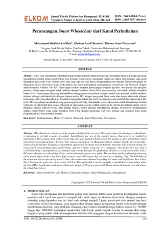 Muhammad, Sholihul Abdillah and Ghulam, Asrofi Buntoro and Rhesma, Intan Vidyastari (2024) Perancangan smart wheelchair dari kursi perkuliahan. Jurnal Teknik Elektro dan Komputasi (ELKOM), 6 (2): 9. pp. 216-224. ISSN 2685-1814