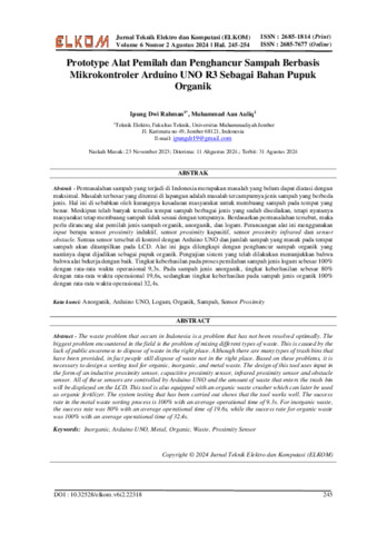 Ipung, Dwi Rahman and Muhammad, Aan Auliq (2024) Prototype alat pemilah dan penghancur sampah berbasis mikrokontroler arduino UNO R3 sebagai bahan pupuk organik. Jurnal Teknik Elektro dan Komputasi (ELKOM), 6 (2): 12. pp. 245-254. ISSN 2685-1814