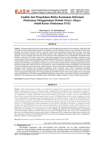 Dian, Saputra and M., Said Hasibuan (2024) Analisis dan pengelolaan risiko keamanan informasi Puskesmas menggunakan metode octave allegro (studi kasus : Puskesmas XYZ). Jurnal Teknik Elektro dan Komputasi (ELKOM), 6 (2): 13. pp. 255-261. ISSN 2685-1814
