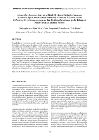 Christopherous, Diva Vivo and Citra, Fragrantia Theodorea and Erik, Idrus (2023) Molecular docking senyawa bioaktif ligan ekstrak caulerpa racemosa agen antibakteri potensial terhadap bakteri initial colonizer streptococcus mutans dan veillonella parvula pada tahapan pembentukan biofilm mulut. In: Prosiding KPPIKG 2023: The 19th Scientific Meeting and Refresher Coursein Dentistry, Faculty of Dentistry, Universitas Indonesia, 2-4 Februari 2023, Jakarta Convention Center.