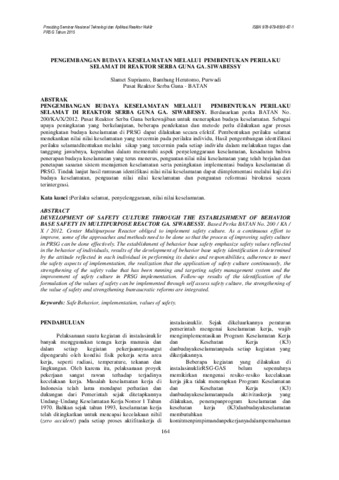 PENGEMBANGAN BUDAYA KESELAMATAN MELALUI PEMBENTUKAN PERILAKU SELAMAT DI REAKTOR SERBA GUNA GA. SIWABESSY. Berdasarkan perka BATAN No. 200/KA/X/2012. Pusat Reaktor Serba Guna berkewajiban untuk menerapkan budaya keselamatan. Sebagai upaya peningkatan yang berkelanjutan, beberapa pendekatan dan metode perlu dilakukan agar proses peningkatan budaya keselamatan di PRSG dapat dilakukan secara efektif. Pembentukan perilaku selamat menekankan nilai nilai keselamatan yang tercermin pada perilaku individu, Hasil pengembangan identifikasi perilaku selamatditentukan melalui sikap yang tercermin pada setiap individu dalam melakukan tugas dan tanggung jawabnya, kepatuhan dalam memenuhi aspek penyelenggaraan keselamatan, kesadaran bahwa penerapan budaya keselamatan yang terus menerus, penguatan nilai nilai keselamatan yang telah berjalan dan penetapan sasaran sistem menajemen keselamatan serta peningkatan implementasi budaya keselamatan di PRSG. Tindak lanjut hasil rumusan identifikasi nilai nilai keselamatan dapat diimplementasi melalui kaji diri budaya keselamatan, penguatan nilai nilai keselamatan dan penguatan reformasi birokrasi secara terintergrasi.