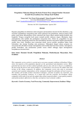 Yusup, Arip and Dwi, Warni Wahyuningsih and Diana, Pramudya Wardhani (2024) Pengolahan makanan ringan berbasis potensi desa sebagai sumber ekonomi kreatif Desa Kradinan Kec. Dolopo Kab. Madiu. Jurnal Pengabdian Masyarakat Manage, 5 (2): 15. pp. 139-146. ISSN 2721-6608